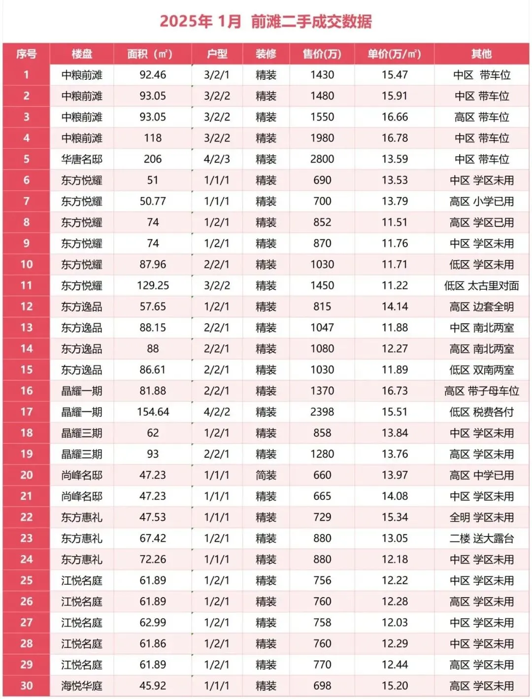 • 需求结构变化:1月前滩二手房成交中,挂学区刚需小户型占主力,改善型三房户型略有增加。