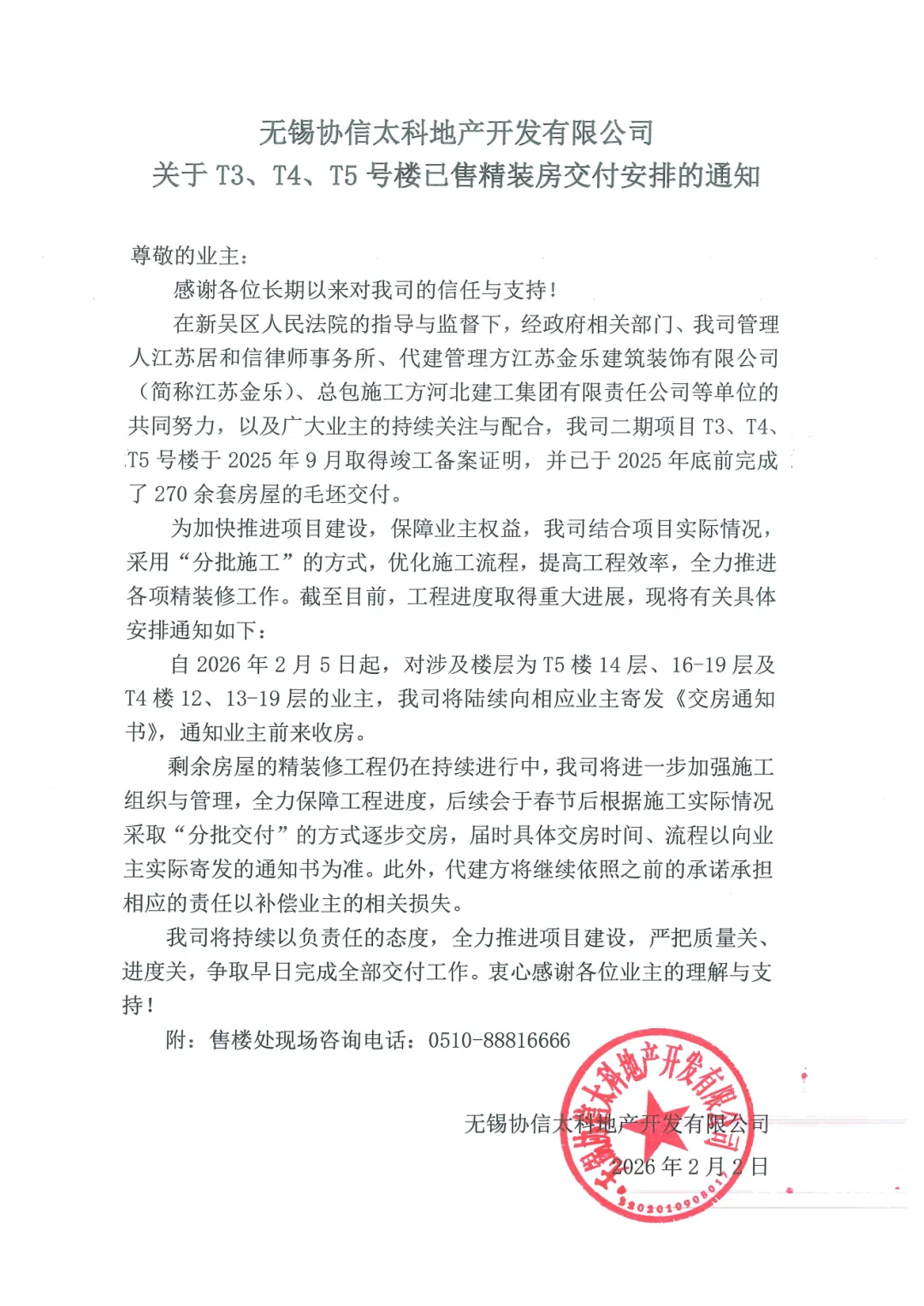 无锡协信太科地产开发有限公司关于T3、T4、T5号楼已售精装房交付安排的通知
