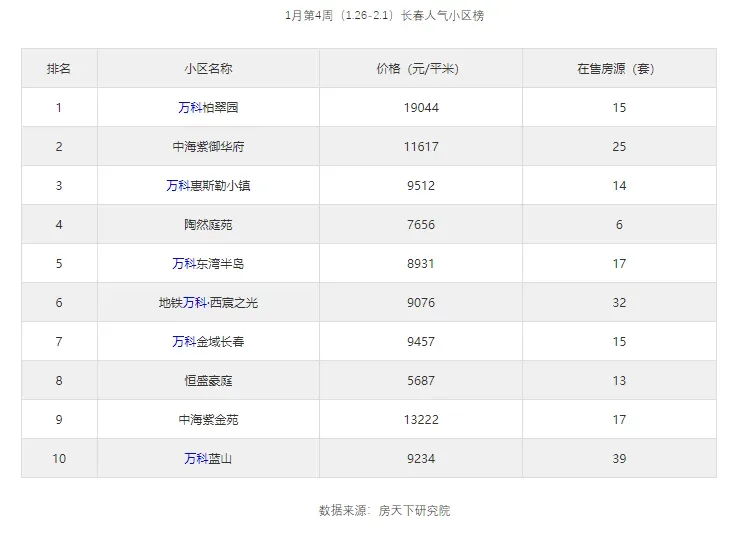 房天下研究院数据显示,万科柏翠园1月第4周(1.26-2.1)成为长春人气最高小区。据了解,该小区位于南湖新村中街999号,目前价格为19044元/平米,与此同时,中海紫御华府和万科惠斯勒小镇等小区也入榜。