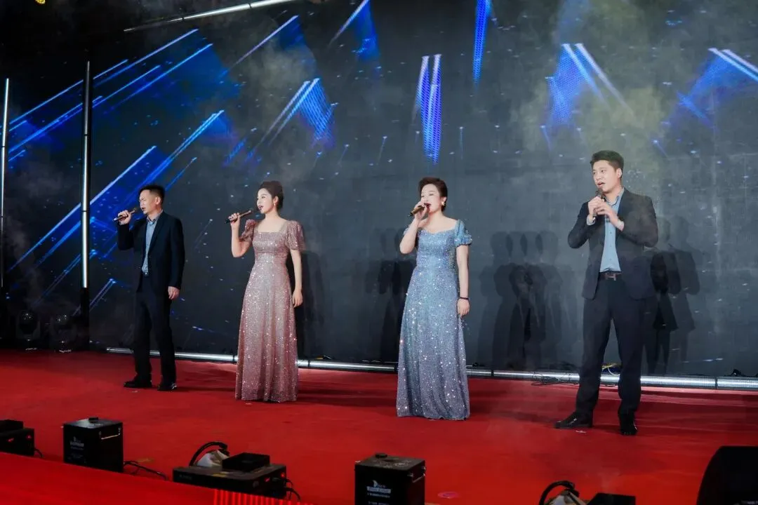 同心筑梦 唱响金辰。四位员工代表登台领唱,带领全体金辰人共同唱响司歌《金辰之梦》。激昂的旋律回荡在宴会大厅,凝聚着每一位金辰人的初心与梦想,将“我们是一家人”的情感认同推向最高潮。
