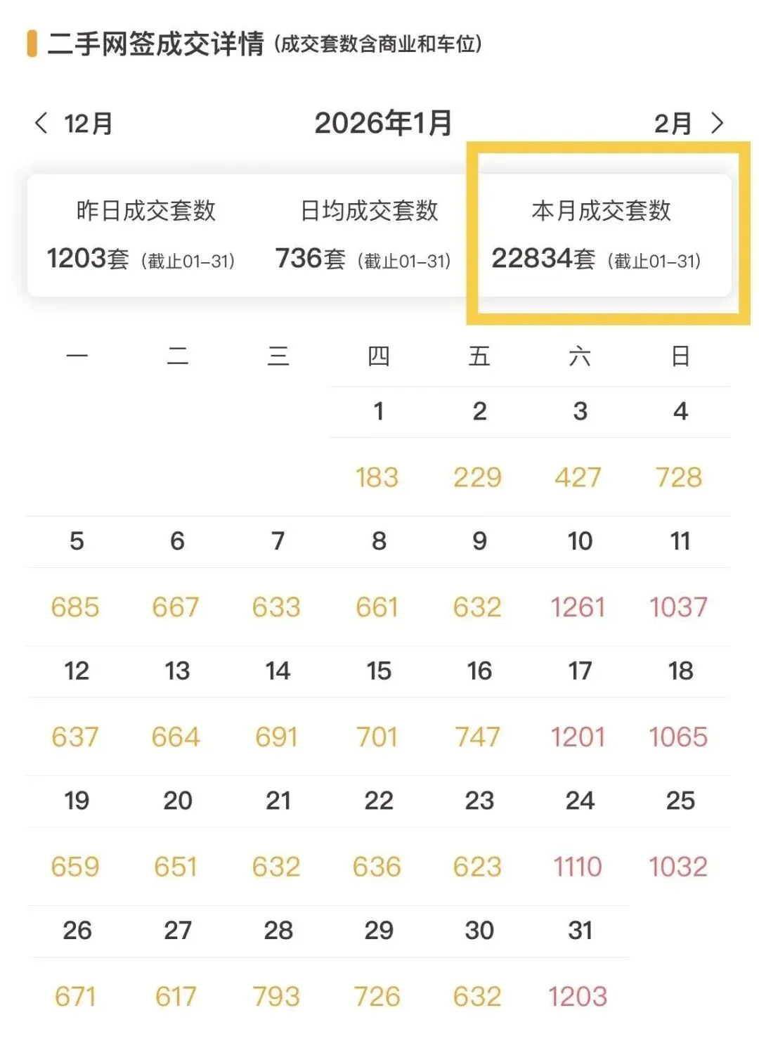 数据显示,1 月上海二手房成交 22834 套,不仅远超 2025 年 1 月的 18389 套,更大幅超越 2024 年 1 月的 16411 套,且已连续 3 个月成交突破 2.2 万套。
