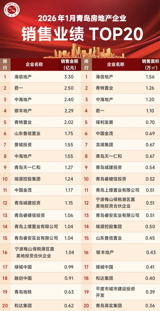 2026年1月份,青岛房地产企业销售金额TOP20企业合计销售金额为29.5亿元,销售面积TOP20企业合计销售面积13.38万平。海信地产在2026年3.3亿元/2.56万平的销售业绩夺得销售金额排行榜面积榜双冠军;君一以2.5亿元/1.1万平的销售业绩位列销售金额第二名、面积排行榜第四名;同时中海地产以2.4亿元/1.2万平的销售业绩位居金额榜第三名、面积榜第三名。