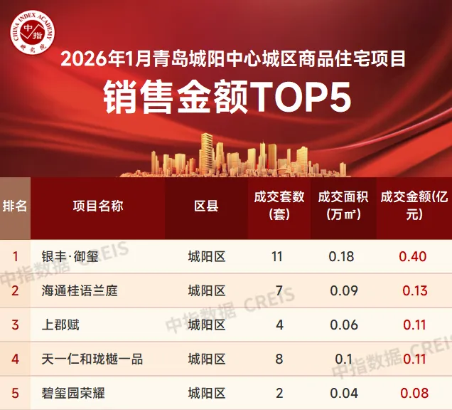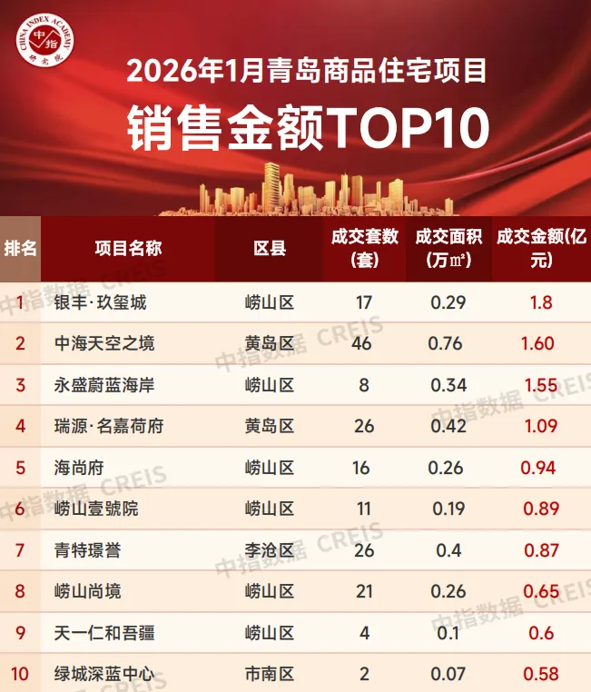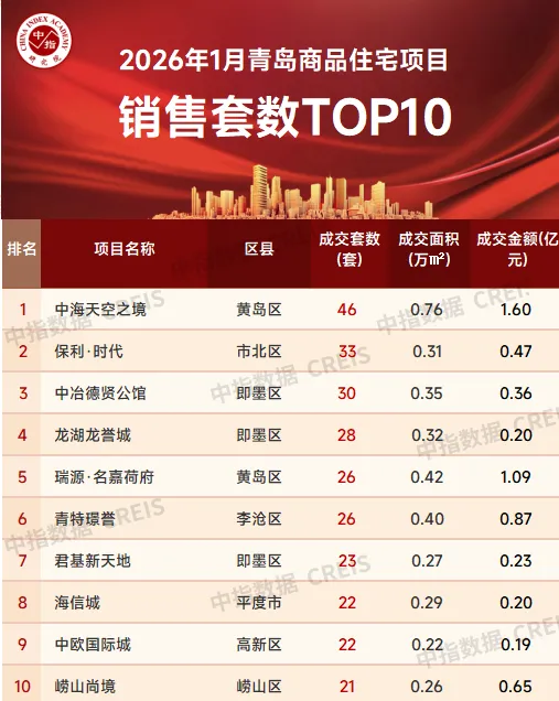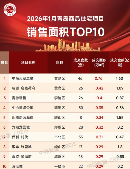 数据来源:中指数据CREIS(点击查看)特别声明:房地产企业销售数据统计与项目销售数据统计均是以2026年1月1日-1月30日期间商品住宅合同销售额为依据,主要依据中指数据CREIS(点击查看)在青岛的销售监测数据;并同时参考企业提供的相关数据,对少数没有在监测范围内的项目,由企业提供相关文件,经审核,也纳入统计范围,集中网签的已售罄项目不纳入榜单。本报告仅供参考,不对使用报告及其内容所引发的任何直接或间接损失承担责任。