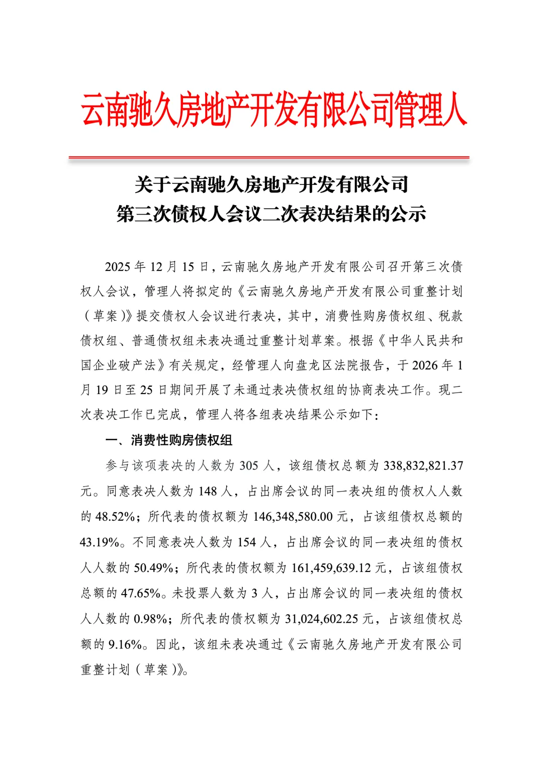 >关于云南驰久房地产开发有限公司第三次债权人会议二次表决结果的公示