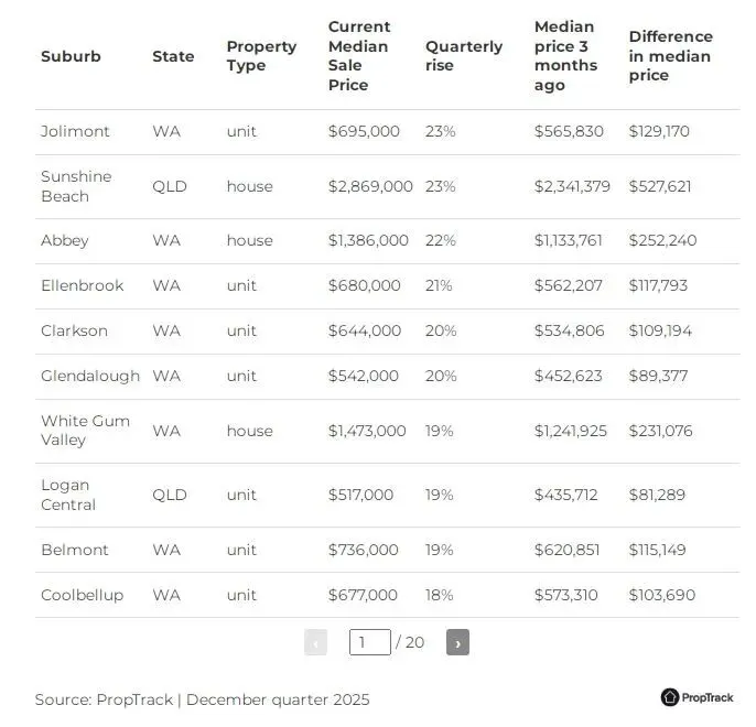 最新数据显示,房价上涨势头强劲的地区已经浮出水面。请查看下表,看看你所在的郊区是否榜上有名。
