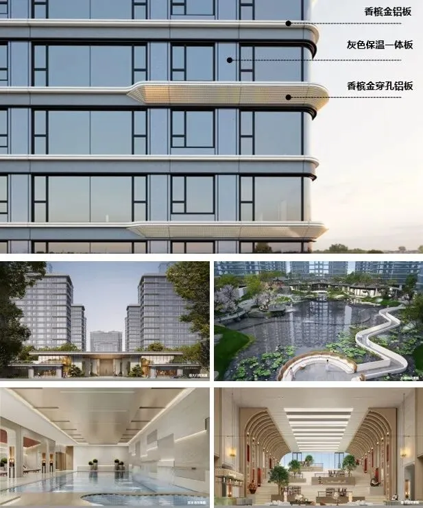 品质与设计: 项目外立面采用热弯玻璃、香槟铝板与局部石材相结合,打造现代典雅形象。约8000㎡新中式中央水景、约3000㎡高端会所以及高得房率户型设计(100%-113%),体现了“造生活”而非“造房子”的产品理念。