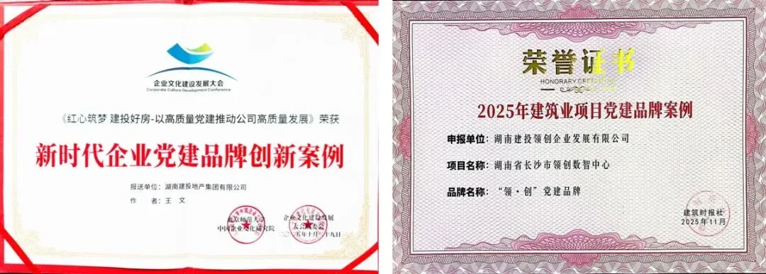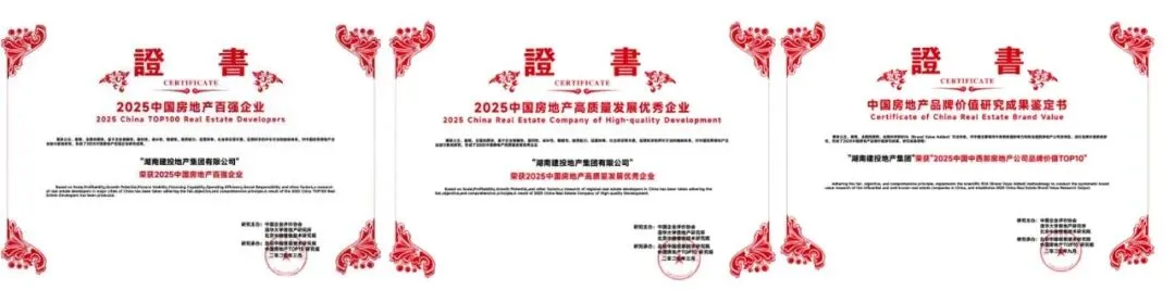2025年,企业荣耀跻身 “2025中国房地产百强企业”主榜单,成为湖南省第二家获此殊荣的房企,并同步斩获 “2025中国房地产高质量发展优秀企业” 称号。此外,连续第三年稳居“中国中西部房地产公司品牌价值TOP10” 行列。