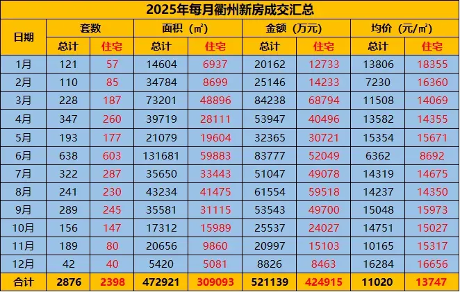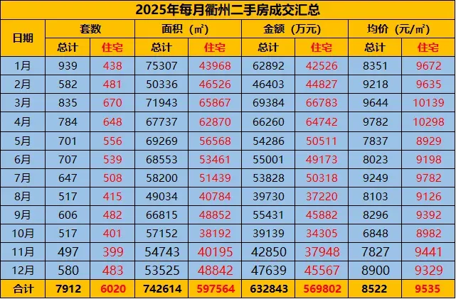 回顾2025年1-12月,衢州二手房共成交7912套,其中住宅6020套,成交均价9535元/㎡。