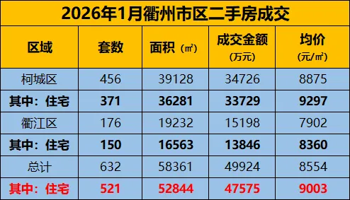 数据显示,2026年1月衢州市区(柯城区+衢江区)二手房共成交632套,其中住宅成交521套,住宅备案均价9003元/㎡,环比上月下跌3.5%。