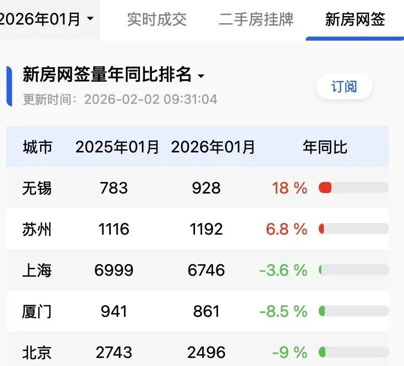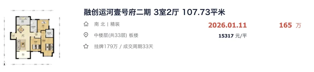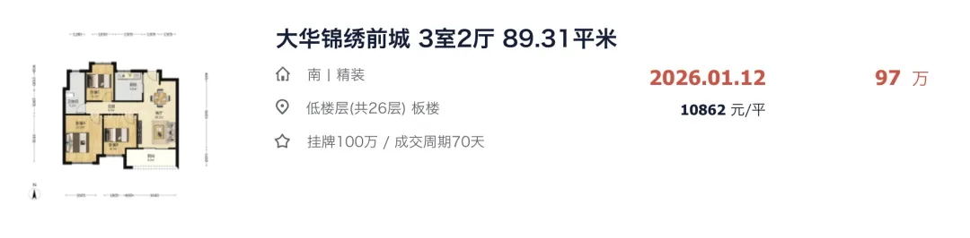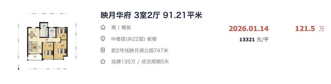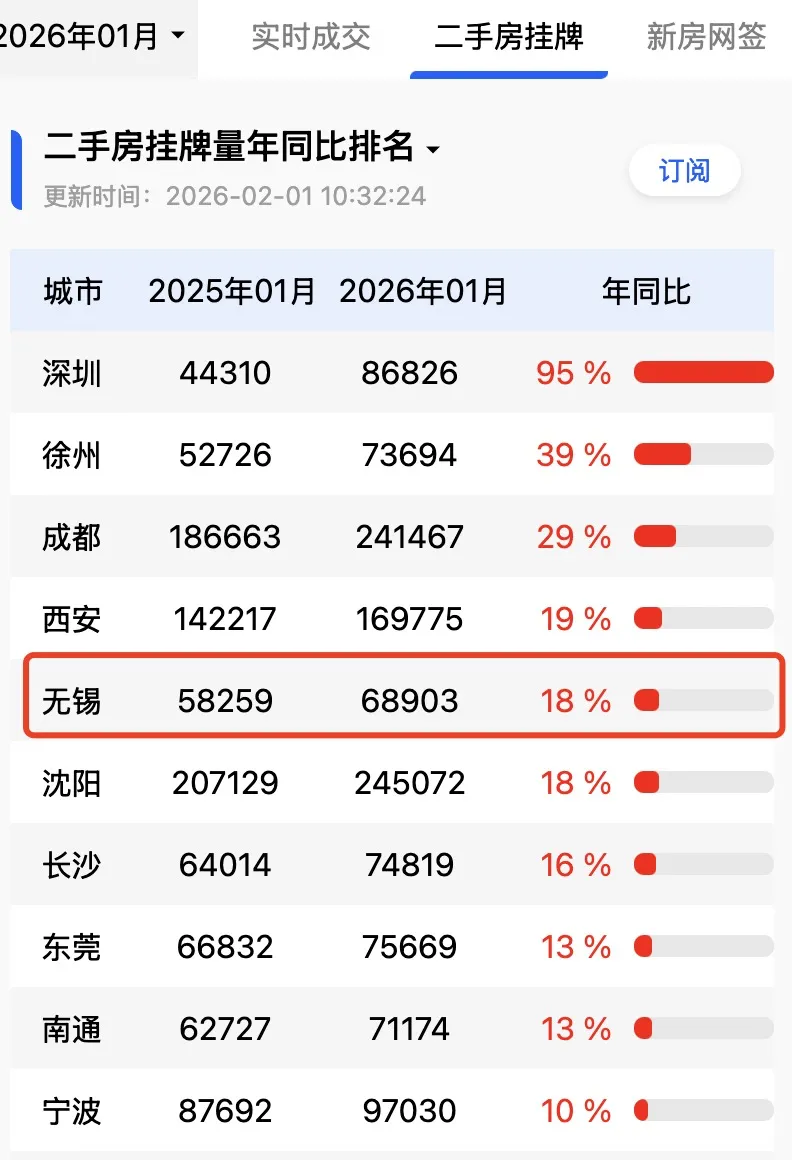 从冰山指数来看,无锡2026年1月新房网签量是928套,同比去年增长了18%,增长率在全国排名第一。无锡2026年1月二手房实时成交了3766套, 比起2025年1月成交的1722套,同比增长了118%,年同比排名第二。与上个月3735套相比,实时成交量有小幅上涨,月环比涨幅0.8%。就最新成交的二手房房源来看,一些优质房源成交周期是比较快的。比如锡东新城的映月华府91.21平3室2厅,成交价121.5万,单价13321元/平,成交周期仅5天。惠山新城的大华锦绣前城89.31平3室2厅,总价97万,单价10862元/平,成交周期70天。还有梁溪主城的融创运河壹号府二期3室2厅107.73平,总价165万,单价15317元/平,成交周期33天。很明显,这些成交快的房源性价比达到了一定高度,房东做出了很大让步。相比之下,“老破大”以及位置相对偏远的小区,成交价向下的幅度更大,单价不超一万的也占有较大比例。位置好、品质高、资源多的房源,价格就比较坚挺。比如河埒口紫金伴山A区有房源挂牌单价24990元/平,万象城板块的太湖国际一街区挂牌单价22427元/平。回过头来看二手房整体挂牌量,全国在2026年1月总挂牌2899880套,同比去年增长了8.8%;无锡挂牌68903套,同比去年增长了18%,排名第五。无锡许多政策同步利好新房二手房市场,比如今年1月1日执行的“买房不满两年卖出,由5%降至3%;买房两年及以上卖出,免增值税”;“在2026年1月1日至2027年12月31日期间,卖旧买新返还全部个人所得税”。小区位于蠡湖边,万科精装3房,98.39平米,中间楼层。