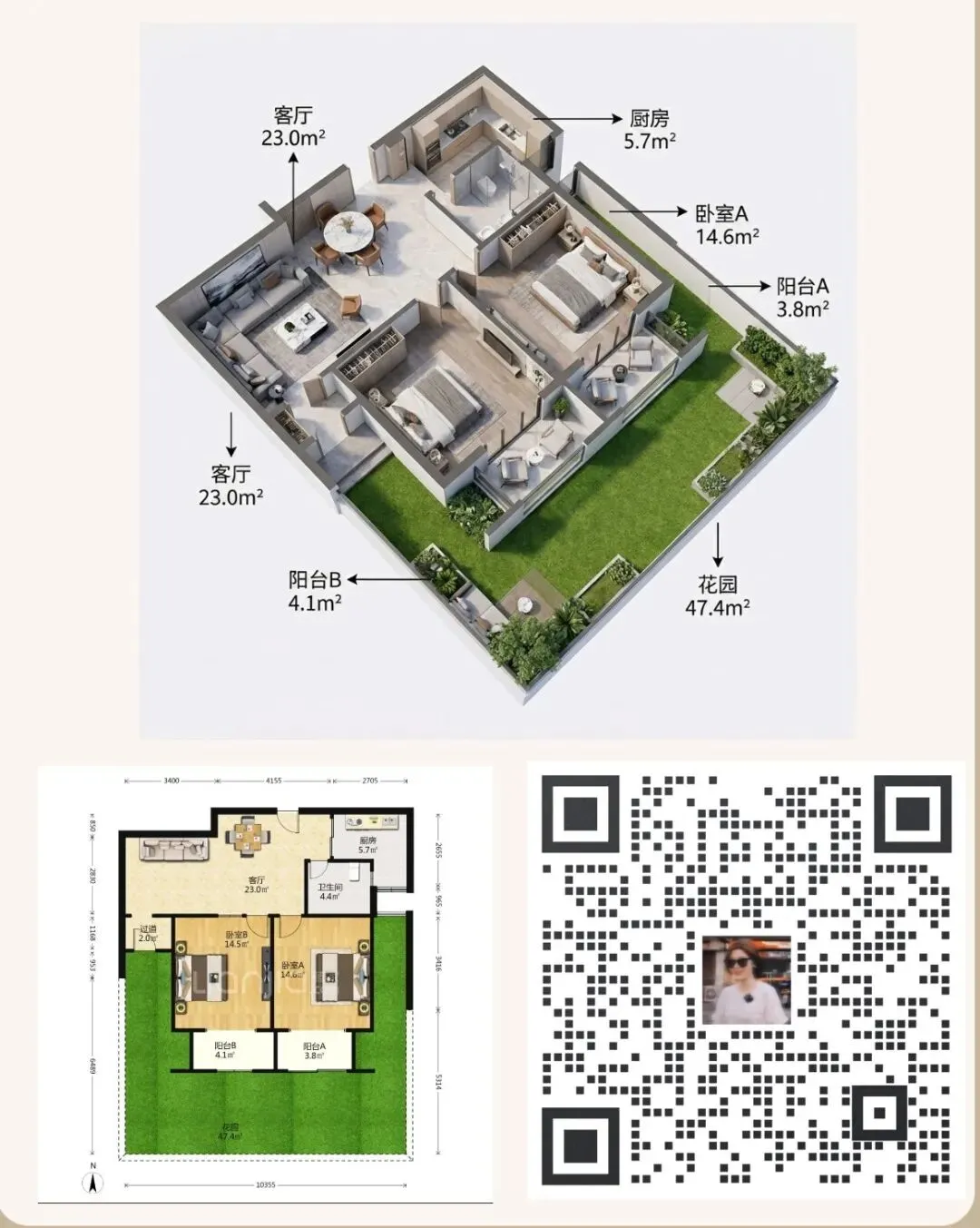该房源122.26平,3室2厅2卫,带100平大露台,大三居采光好。