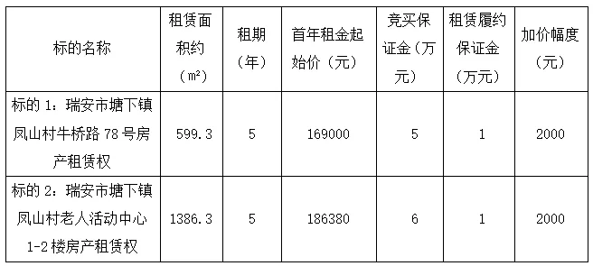 受委托,定于2026年2月9日上午9时至上午11时(延时除外),在农村综合产权交易网上(网址:https://zj.nccq.ccb.com/#/font;站点名在网站左上角切换至:瑞安市农村产权服务中心有限责任公司),对下述标的进行增价式公开竞价,现公告如下: