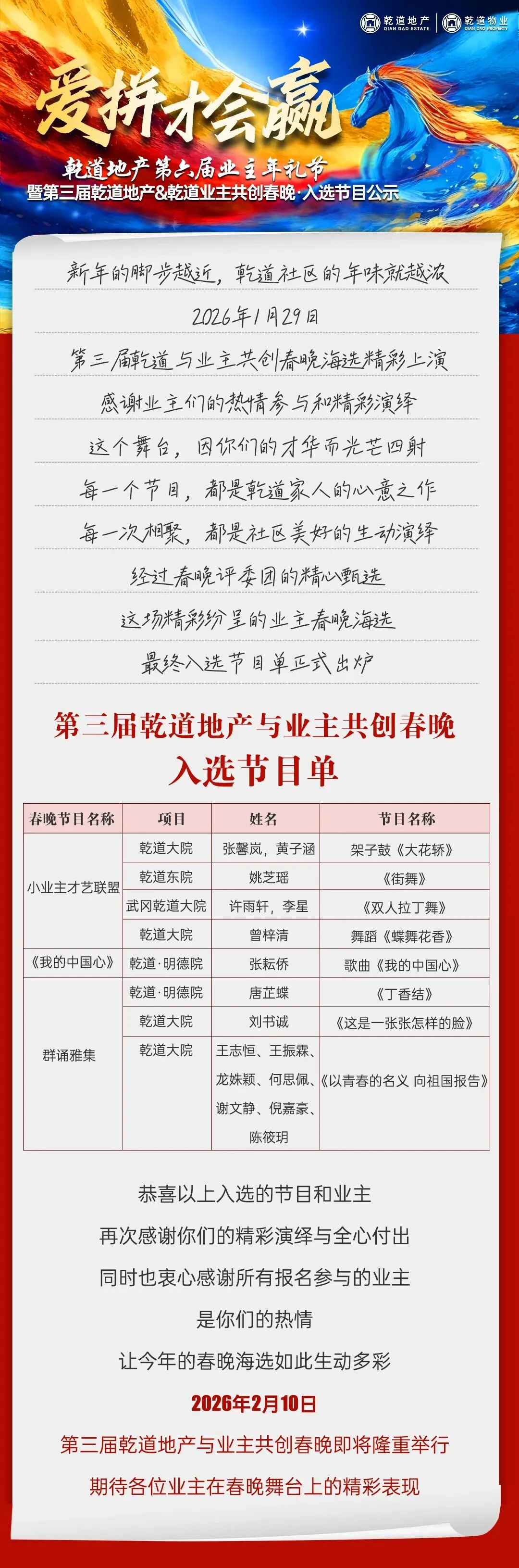 公示|第三届乾道地产与业主共创春晚入选节目揭晓