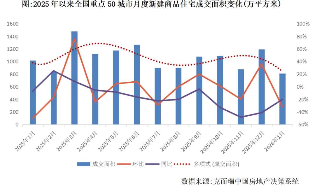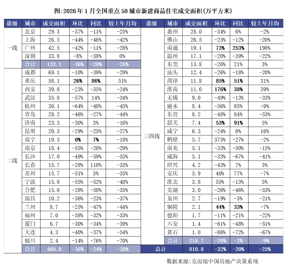 克而瑞监测数据显示,2026年1月,全国重点50城市新建商品住宅成交面积约810万平方米,环比下降32%,同比减少20%,相比上年月均下降25%。