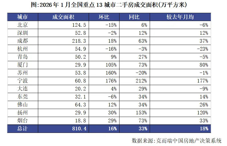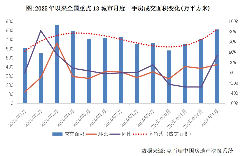 克而瑞监测数据显示,2026年1月,全国重点13城市二手房成交面积约810万平方米,环比上升16%,同比增长33%,相比上年月均增18%。