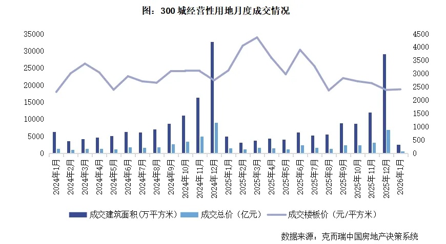 2026年1月,土地成交建筑面积和金额均环比回落90%,同比来看二者分别下降48%和59%。供地规模方面,截至25日本月土地供应面积3360万平方米,同比下降8%。从市场热度来看,由于本月成交地块多为2025年末供应的年度收尾地块,优质高总价地块成交占比偏低,本月溢价率延续低位,至截稿时10亿元以上的宅地均为底价成交。