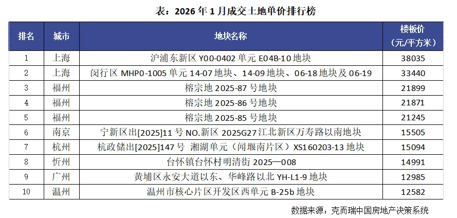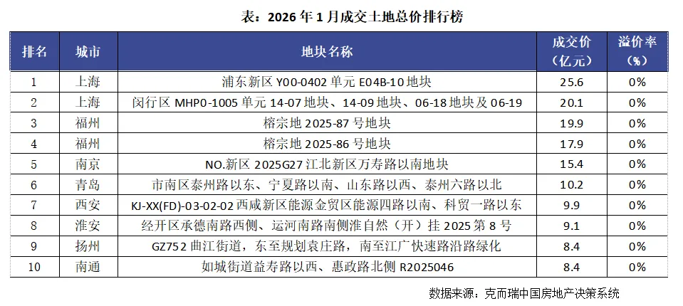 受供地节奏的季节性影响,本月高总价地块成交频次显著下降,至截稿时仅有6宗宅地成交总价超过10亿元。从土拍热度来看,两榜入榜宅地均为底价成交,上海2026年第一次土拍的2宗宅地也均为底价成交。
