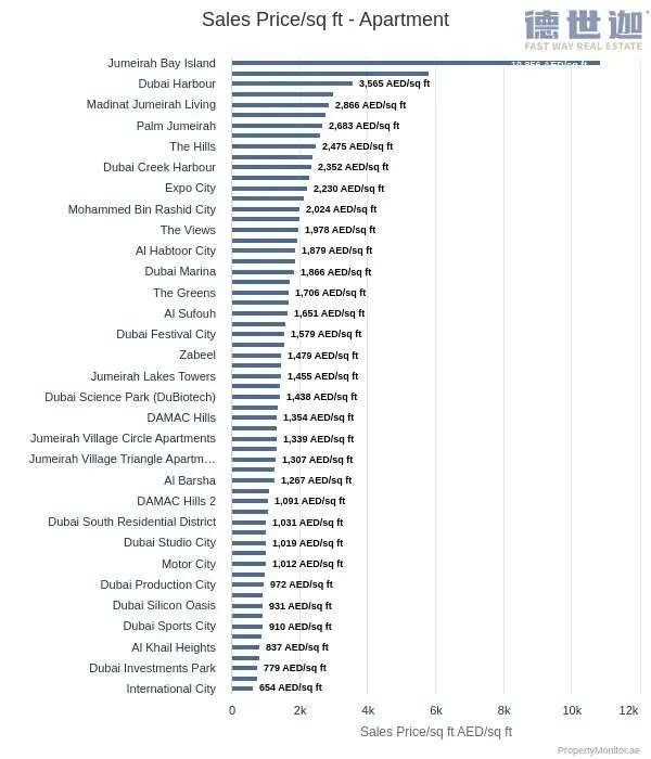 ▲ 2026年1月迪拜各区域【公寓】销售单价(迪拉姆/平方英尺)