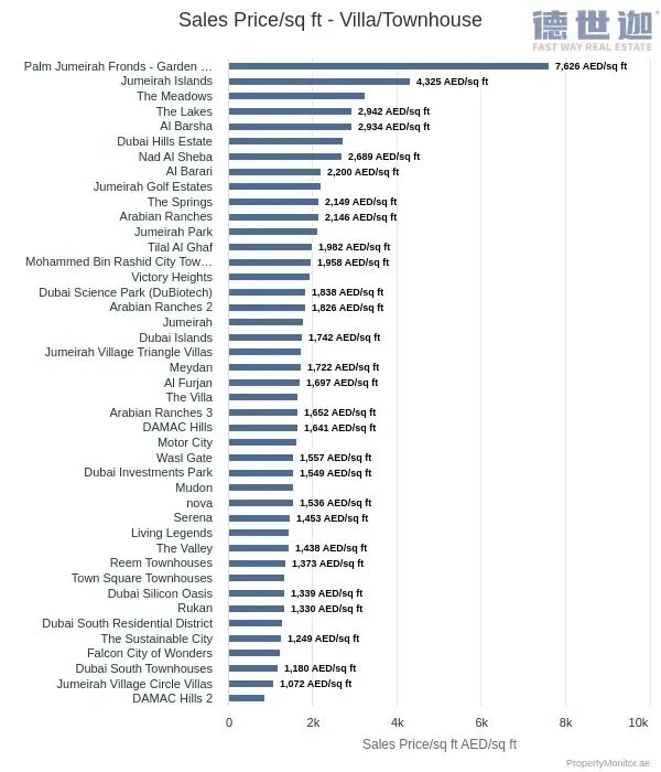 ▲ 2026年1月迪拜各区域【别墅】销售单价(迪拉姆/平方英尺)