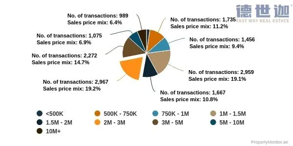 ▲ 2026年1月迪拜各销售价格区间占比图(eg:2-3百万迪拉姆的房产交易量2967套,占比19.2%)