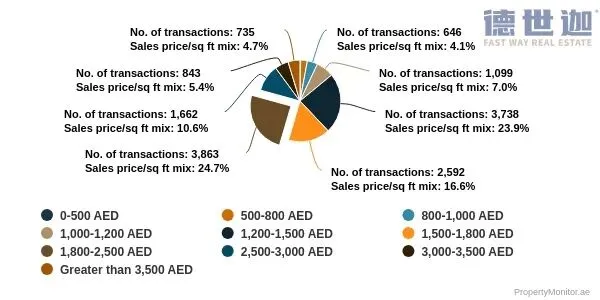 ▲ 2026年1月迪拜房产各销售价格区间/sq.ft的销售量分布图(eg:1800-2500AED的房产交易量3863套,占比24.7%)