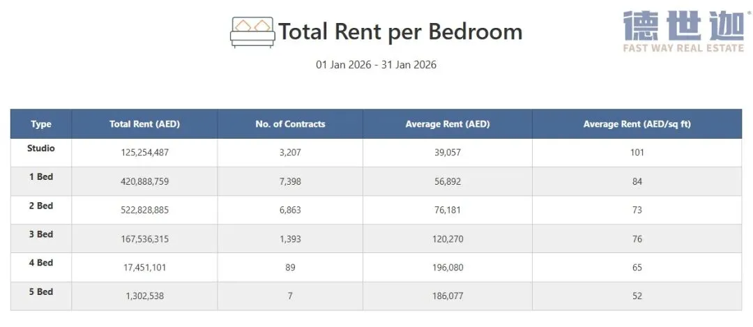 ▲2026年1月迪拜【公寓】各居室类型租赁数据汇总
