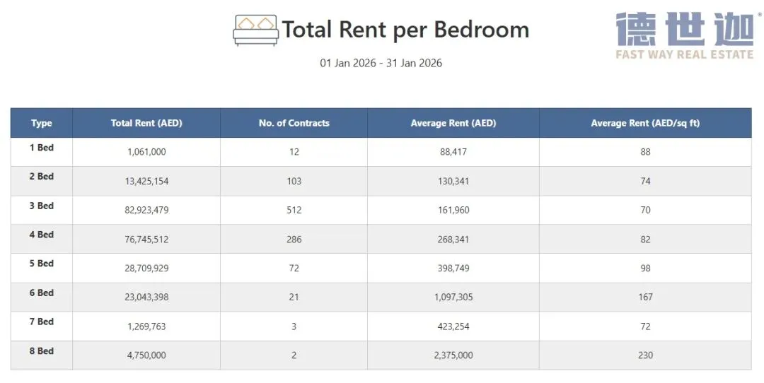 ▲2026年1月迪拜【别墅】各居室类型租赁数据汇总