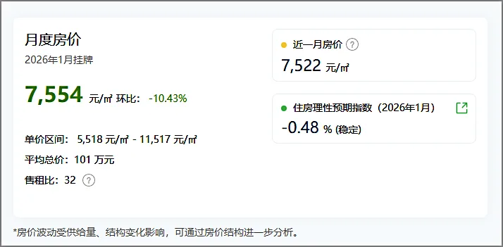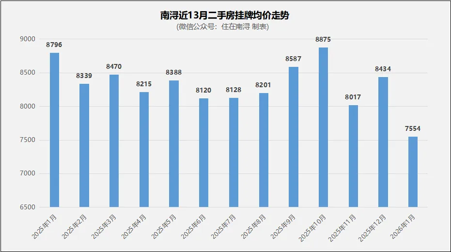 据全国房价行情网数据统计,刚刚过去的2026年1月,南浔二手房住宅挂牌均价约7554元/m²,较上月环比下跌10.43%。目前,南浔二手房挂牌价格处于近期低位。与2025年1月相比,同比下跌14%。