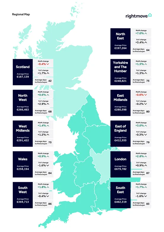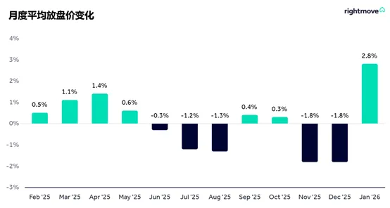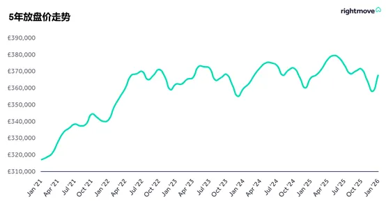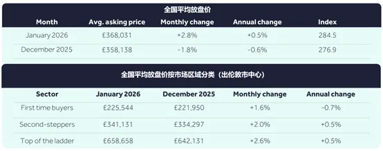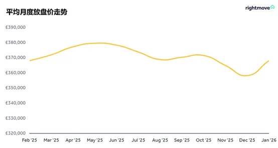 本月新上市待售房产的平均价格上涨2.8%(+9,893英镑),达到368,031英镑。这是Rightmove 25年来发布房价指数以来,1月份涨幅最大的一次,也是自2015年6月以来单月涨幅最大的一次。在2025年的12个月中,有8个月的房价表现低于历史平均水平,尤其是在年底。但目前,全国平均房价已比去年同期上涨0.5%。1月份的回升使平均要价接近2025年8月的水平,市场情绪也从11月预算的传言和不确定性中恢复过来。然而,英国各地和地方市场的房价走势波动较大。虽然今年1月大多数地区的房价都在上涨,但东米德兰兹East Midlands和苏格兰的房价却逆势下跌。年初房价回升是市场健康的一个好兆头,但卖家切不可被新年的热情冲昏头脑。目前市场上待售房屋的数量,以及与之竞争的卖家数量,仍处于2014年以来同期最高水平。此外,已有三分之一的待售房屋正在降价。因此,卖家在设定要价时,需要在价格目标和市场实际情况之间找到平衡,才能最大限度地提高找到买家并成功售房的机会。