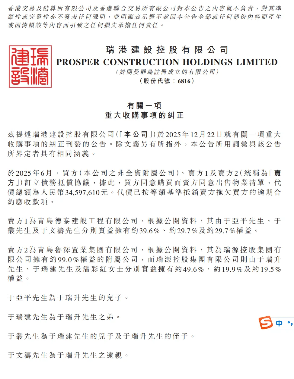 据瑞港建设公告,于亚平、于丛及于文涛分别拥有青岛德泰建设约39.6%、29.7%及29.7%权益。