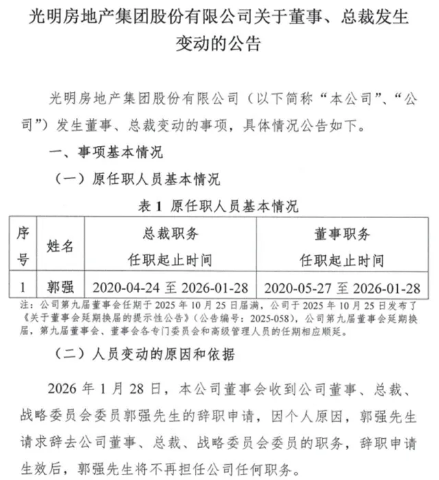1月29日,光明地产发布公告,正式确认了公司董事、总裁郭强的离职。公告以惯常的措辞表示,此次变动为“正常人事变动”,并对郭强任职期间的贡献予以感谢。