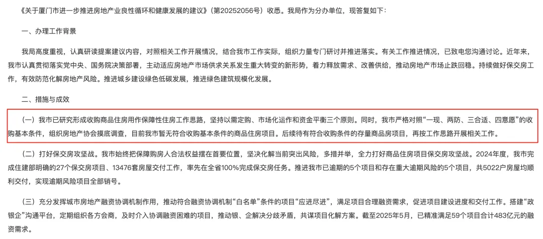 但关键在后面:「严格对照“一现、两防、三合适、四意愿”的收购基本条件,组织房地产协会摸底调查,目前厦门暂无符合收购基本条件的商品住房项目。」