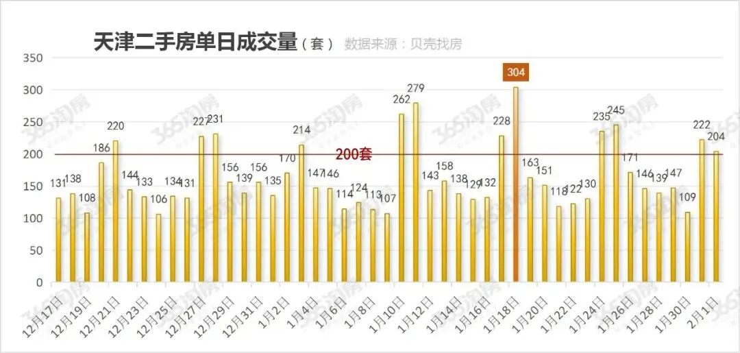 以天津的市场容量来说,周末200套的成交量是荣枯线,300套是热度线。