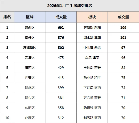 1月二手房成交TOP3,来自河西、南开、滨海。