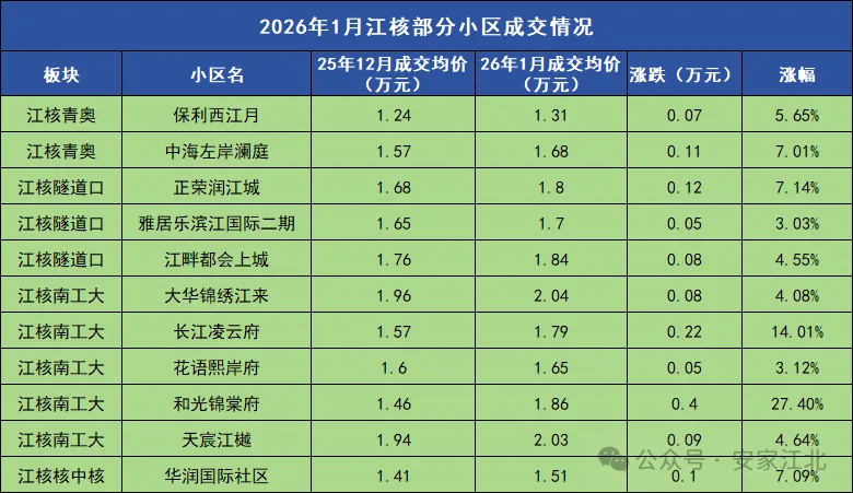 根据相关数据显示,2026年1月南京二手房成交量高达9173套,相较于2025年12月的7079套,成交量暴涨29%,涨幅位居全国第二。临近年关的1月可以说是传统淡季,南京二手房能有这样的表现,可以说是远远超出市场预期。还有中介表示:“今年1月份冬天是比较冷的,但是看房的人去非常多,这样的带看量有点一反常态”。就连我们的购房社群中潜水多年的群友也跑过来问我:“现在房价是不是到底了,今年会不会涨,现在要不要抄底”。除了带看量和成交量的攀升外,在成交价格上,不少小区也开始逆势回涨,二手房价格开始趋于稳定。今天,我梳理了江北核心区部分二手房小区成交情况,看一下1月江核哪些小区成交价格较为亮眼。江核11个小区成交均价上涨,部分小区房价筑底回升