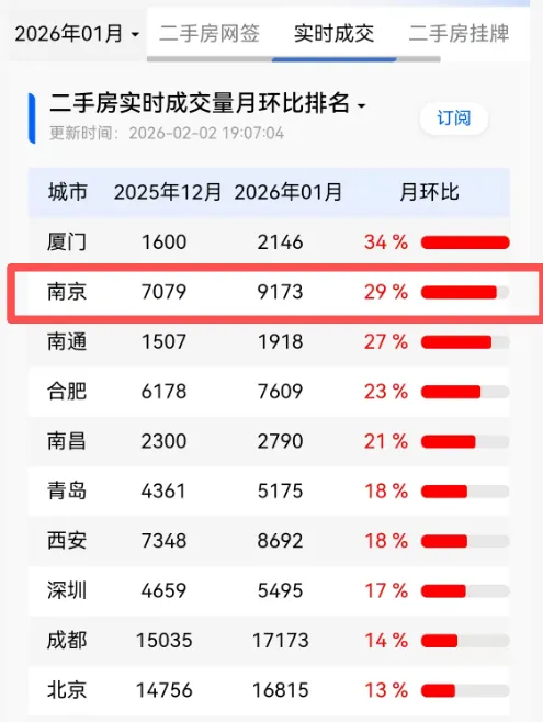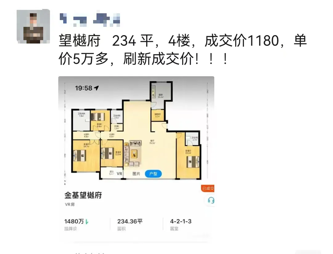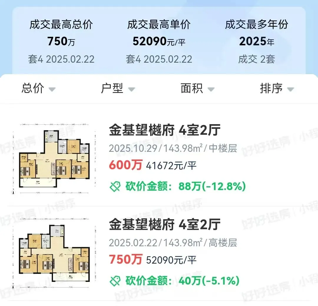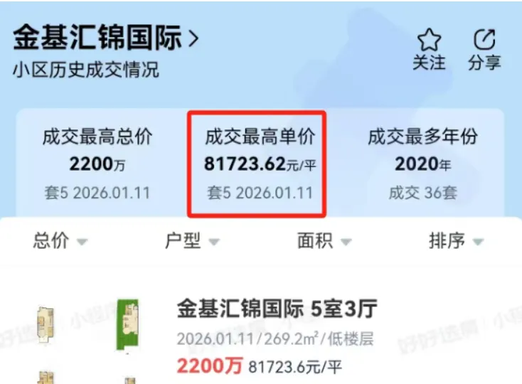 2026年的第一个月,贝壳系列数据证实南京二手房成交量暴增;楼市日历的数据显示,在传统的1月淡季,南京今年表现极其亮眼:二手房成交量达9173套,环比2025年12月的7079套,成交量大涨29%,涨幅位居全国第二;同比2025年1月的4541套,更是暴涨102%!当然,这其中也有过年迟早的原因,通常年底本来就是一个二手房的成交小高峰。房东不愿意再等,买房人认为好谈价,双方一拍即合。即使如此,南京二手房的市场表现依旧超越预期,因为这个成交量不仅仅高出同期,高出12月,甚至高出了2025年的金九银十,是近8个月以来的最好成绩!在冰山指数上,1月南京二手房成交价回涨了约0.2%,增幅并不算大,但在高成交量的情况下,积极信号尤为明显:朋友圈刚刚一个重磅消息曝出,金基望樾府最新一套成交,234㎡的4楼大平层,以1180万元的总价成交,刷新该小区的二手房成交总价记录;同时超5万元/㎡的成交单价,使得南部新城二手房市场,再次站回5万的房价阶梯!某种程度来讲,位置并不在大校场板块绝对核心的望樾府,当年硬是凭借“高一档”的产品力,硬生生将自己变成了区域新房中的一种标杆、甚至是传说,“金陵几人可望樾”的宣传语更是霸气外露。而其中234㎡户型,便是标杆之上的标杆,在金基望樾府只有一栋楼2#,共34套房源,其是作为收官房源入市,当时开盘要求需首付8成,验资652万,并吸引了451组报名,综合中签率约23%,平均4人抢一套,在开盘两小时内便被全部抢光。这套位于4楼的房源,可以看到当时的上市销许价在4.9万元/㎡,总价一千一百五六十万。和前期房源一样带有5400元/㎡的升级装修包,也就是说,如果业主当时购买了升级包,成本价则还需要加126万左右。从好好选房前期成交数据可以看出,金基望樾府从限售解禁以来,在这个平台上尤其仅有两套成交:2025年2月份,143㎡的高楼层,成交总价750万元,单价5.2万元/㎡;2025年10月,143㎡的中楼层,成交总价600万元,单价4.1万元/㎡。个位数的成交量,其实能看得出业主的“惜售”;从超5万元/㎡到4.1万元/㎡的成交单价,则是其因市场影响而不得不的大势所趋。但现在,大户型回涨至5万元/㎡对于业主来说,这套房源虽然没有赚钱,但对于市场而言却意义非同一般:之于南京豪宅市场,1180万元的总价堪称终极改善,立于2026年千万级成交的头波开门红!建面约269.2㎡5室3厅的低楼层房源,成交总价2200万,成交单价约81723元/㎡!刷新该小区成交单价记录!作为河西中的老牌别墅,金基汇锦国际背后,同样是南京本土房企金基集团。很明显,金基的产品,正在成为南京诸多追求美好生活真谛买房人的共同追求 —— 正是拥有现象级的产品,才能让这种现象在南京楼市一再上演,更是让买房人一次又一次的被金基的产品所“俘获。成功从来没有偶然,长期的成功更是源于金基那近乎偏执的对于打造绝佳产品的坚持:打造城市优秀住宅,绝对不是简简单单的“盖好”房子。商务合作:周胜莲 18358597050(微信同号)