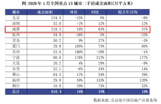 克而瑞监测数据显示,2026年1月,全国重点13城市二手房成交面积约810万平方米,环比上升16%,同比增长33%,相比上年月均增18%。