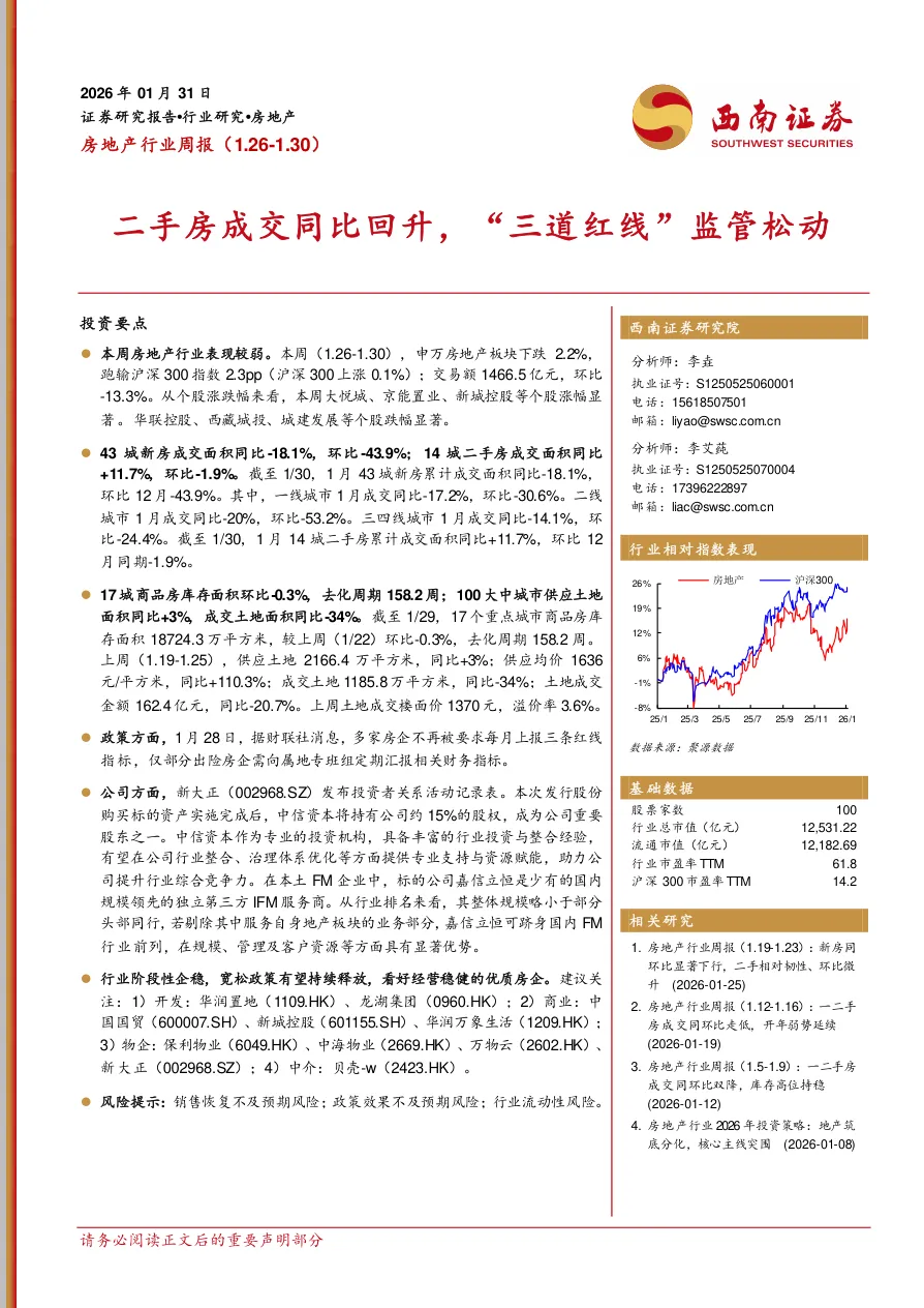 1.26-1.30申万房地产板块下跌2.2%,跑输沪深300指数2.3个百分点,板块交易额1466.5亿元,环比下降13.3%,个股涨跌幅分化明显,大悦城等涨幅显著,华联控股等跌幅较大。1月43城新房成交面积同比降18.1%、环比降43.9%,一线、二线、三四线城市均呈下滑态势,二线城市环比降幅最大;14城二手房成交面积同比增11.7%、环比微降1.9%。截至1月29日,17个重点城市商品房库存面积18724.3万平方米,环比降0.3%,去化周期158.2周;1.19-1.25期间100大中城市土地供应面积同比增3%、供应均价同比涨110.3%,土地成交面积和金额分别同比降34%、20.7%,成交楼面价1370元,溢价率3.6%。政策端,1月28日有消息称多数房企无需每月上报三条红线指标,仅部分出险房企需向属地专班组定期汇报相关财务指标。公司层面,新大正完成相关资产收购后,中信资本将持股约15%成为其重要股东,标的公司嘉信立恒是国内规模领先的独立第三方IFM服务商,剔除服务自身地产板块业务后,其可跻身国内FM行业前列,具备多方面显著优势。行业判断上,房地产行业呈现阶段性企稳态势,后续宽松政策有望持续释放,看好经营稳健的优质房企,建议重点关注开发、商业、物企、中介四大领域的相关标的。同时存在销售恢复不及预期、政策效果不及预期、行业流动性的相关风险。