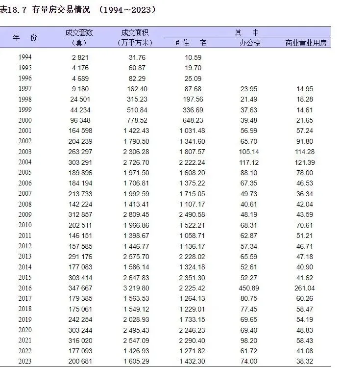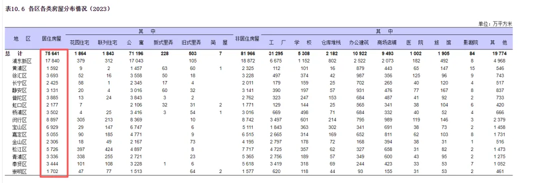 年鉴统计数据是截止到2023年全年的。2023年上海全市房屋合计157607万平方米,其中居住房屋75641万平方米,占比47.9%;非居住房屋81966万平方米,占比52.1%。居住房屋占比一半不到。2023年上海全市常住人口2487.45万人,按照常住人口统计人均居住面积30.4平方米,低于全国平均居住面积10余平方米。看看居住住房的构成。公寓(普通住宅)71196万平方米,占比94%;花园住宅1864万平方米,占比2.46%;联列住宅1843万平方米,占比2.43%;新式里弄228万平方米,占比0.3%;旧式里弄503万平方米,占比0.66%。花园住宅和联列住宅,相对稀缺。2010至2023年14年期间,居住住房面积从52639万平方米增长至75641万平方米,年均增长1643万平方米。2022至2023年,增长1456万平方米。1994年至2023年,上海存量房成交起起伏伏。成交套数峰值年份是在2016年,成交套数347667套,月均28973套;2020及2021年套数也都在30万套以上。近年相对低点的年份是2022年,全年成交177093万套。23年全年成交再次爬上20万套,2024及2025年数据在24~25万套区间,保持在月均2万套以上。上海二手房成交量在稳中有增量!2000到2023年,上海拆迁房最高的一年是2002年,全拆迁户数101097户。2010年后拆迁规模都不高。2019-2021年拆迁户数35780、43318、57415套。2022及2023年拆迁户数到了极低点,分别在19926和15720套。未来的拆迁量有增量空间!