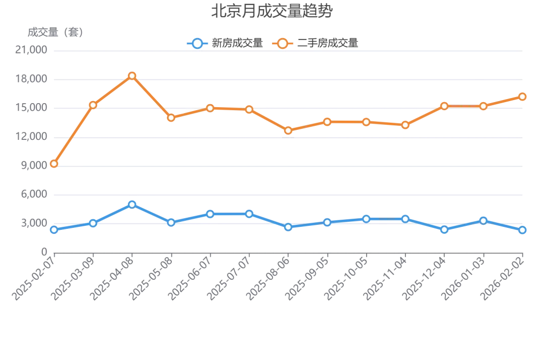 截至2026年2月2日的前30天,北京住房总成交套数达到了18564套,其中二手房贡献了16209套,占据了绝对主导地位,市场份额高达87.3%。