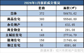 据绍兴市房地产信息网统计数据显示,2026年1月绍兴市越城区商品房市场成交商品房372套,成交面积为56470.62平方米。其中,商品住宅成交360套,成交面积为55546.89平方米;商业物业成交4套,成交面积为291.08平方米;办公地产成交8套,成交面积为632.65平方米。