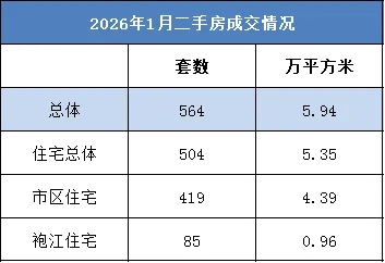 据绍兴市房地产信息网统计数据显示,2026年1月份,绍兴市越城区二手房市场总体成交564套,成交面积为5.94万平方米。其中住宅类二手房成交504套,成交面积为5.35万平方米;非住宅类二手房成交60套,成交面积为0.59万平方米。
