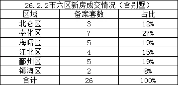 2026年2月2日宁波市六区新房共成交26套,分别为北仑区成交3套,奉化区成交7套,海曙区成交5套,江北区成交4套,鄞州区成交5套,镇海区成交2套