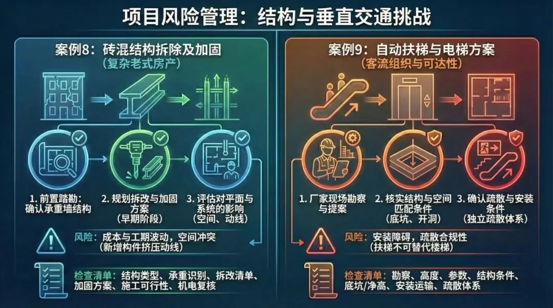 加固方案必须前置:项目进入关键决策前就要结构踏勘与初步方案,平面规划同步预留可能新增构件与检修空间,别等施工阶段“边拆边规划”。