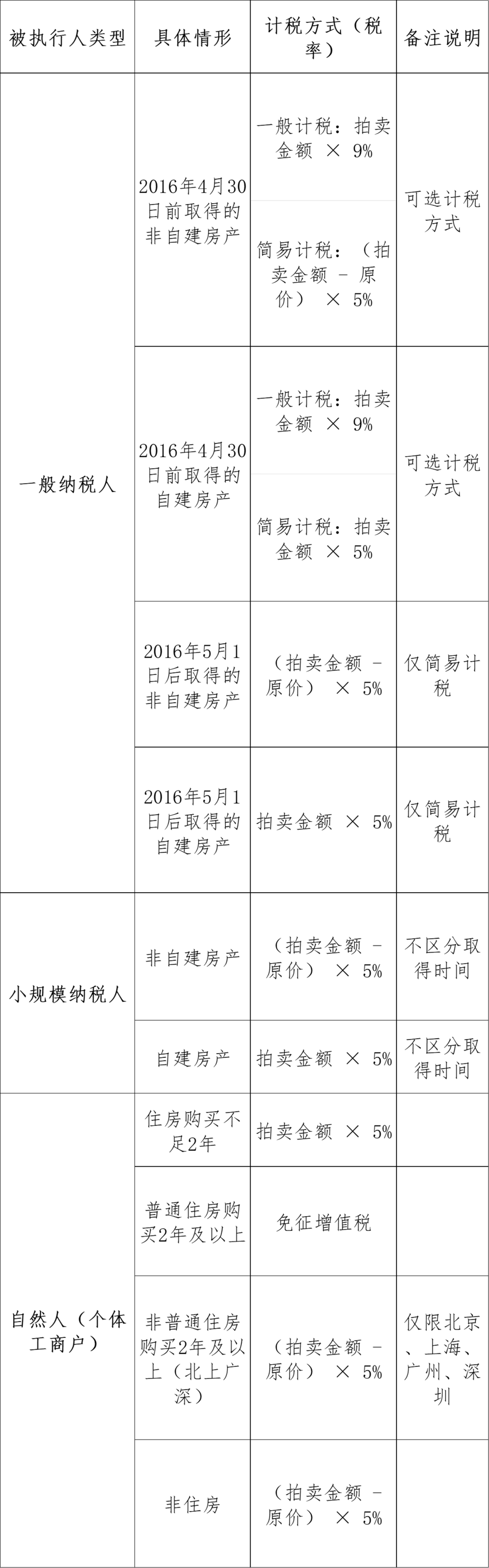 依据《最高人民法院关于人民法院网络司法拍卖若干问题的规定》(以下简称“《网拍规定》”)第三十条的规定,网络拍卖中所涉及的税费,在法律、行政法规有明确规定时,应当由法定主体承担纳税义务;没有明确规定时,法院根据法律原则和实际情况进行裁量决定。2020年9月,国家税务总局与最高人民法院针对税费承担方面的建议达成共识,明确提到最高人民法院将对各级法院提出“严格落实司法解释关于税费依法由相应主体承担的规定”、“严格禁止在拍卖公告中要求买受人概括承担全部税费”等工作要求①。2022年5月,最高人民法院在《关于进一步规范网络司法拍卖房产有关问题的通知》(法明传〔2022〕297号)中进一步明确:“交易税费依照相关法律、行政法规的规定,由相应主体承担是基本原则。各级法院要严格落实该条规定,禁止在拍卖公告中载明‘当次交易税费由买受人概括承担’或类似内容。”