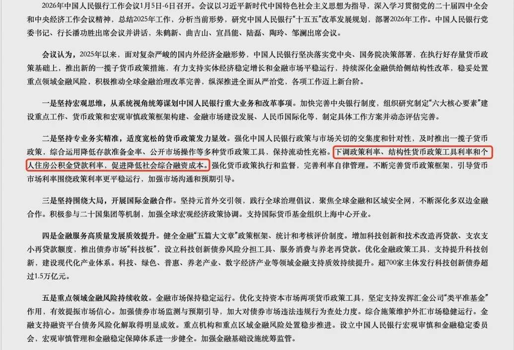 然后1月5日至6日,2026年中国人民银行工作会议召开,部署全年七大重点工作,围绕货币政策实施、金融服务实体经济、风险防控、金融改革开放等核心领域。