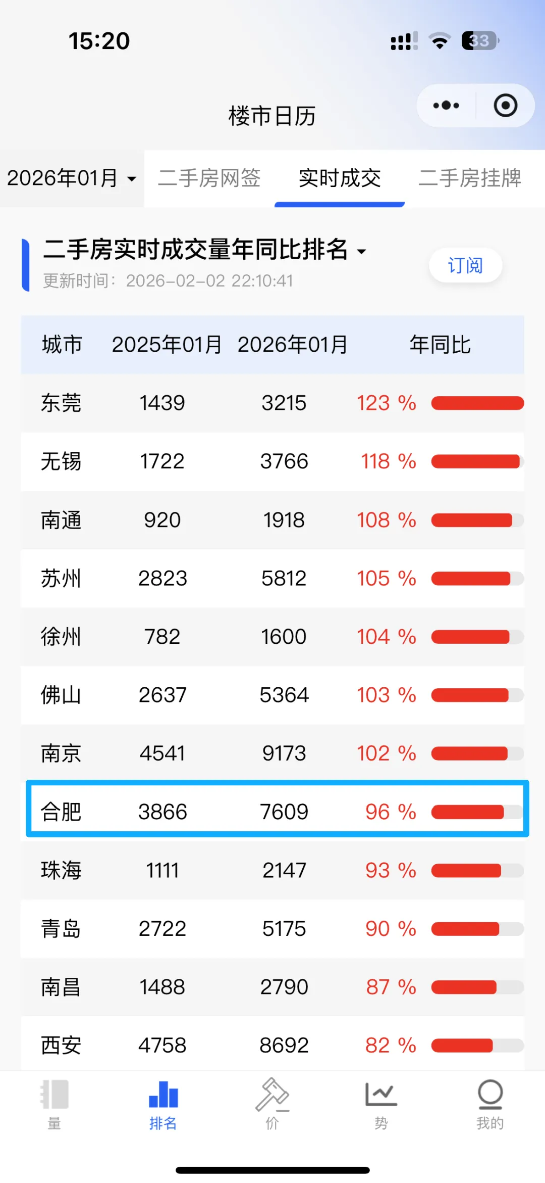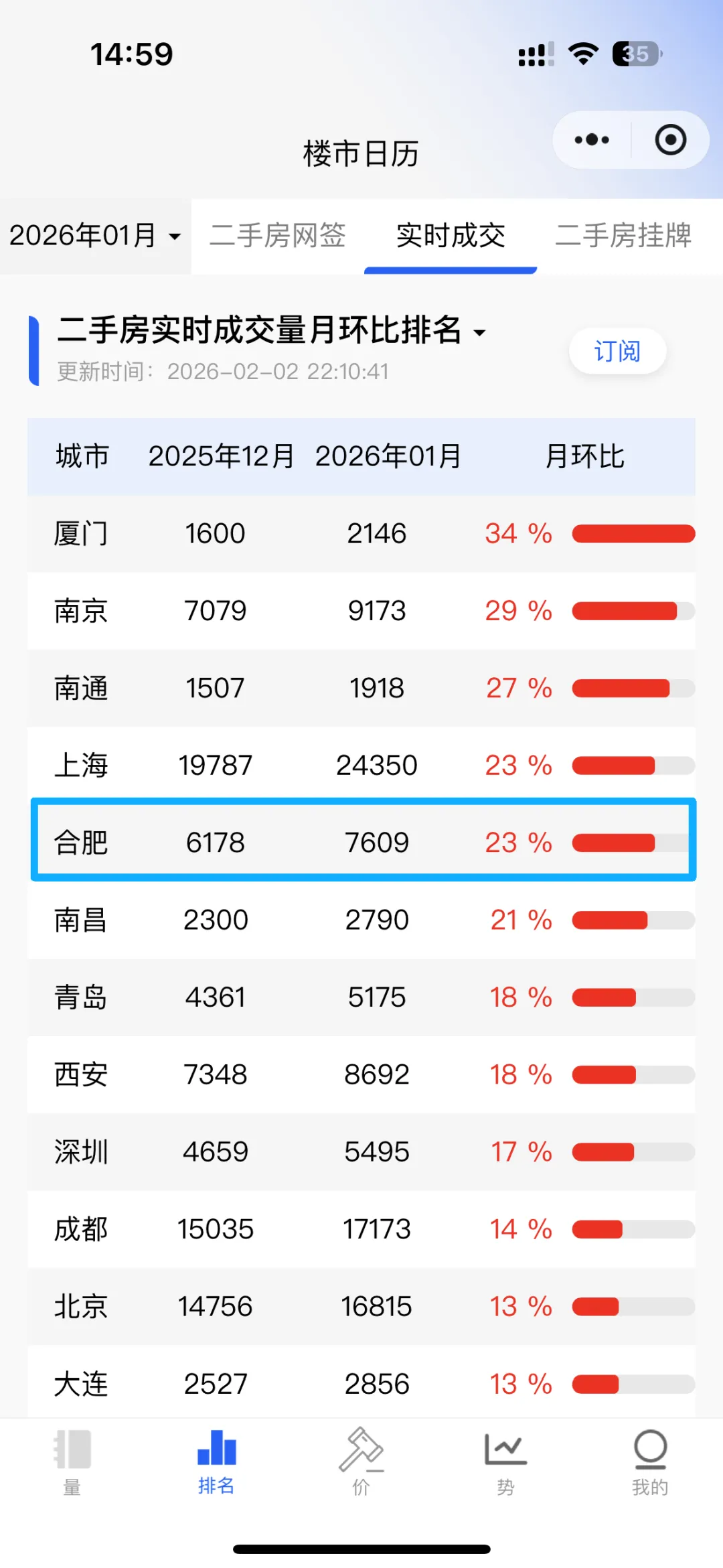 而在冰山指数统计的数据中,合肥二手房更是达到了7609套(受统计口径、房源样本范围、数据截取节点不同影响,各平台成交数据存在小幅差异),数据十分亮眼。环比涨幅23%,与上海持平,排在前列的,仅厦门、南京、南通三个城市。