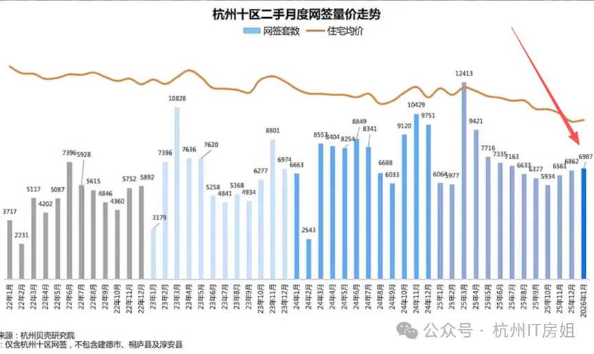 2026年1月,杭州二手房成交套数6987套,环比12月6862套,提升1.8%。