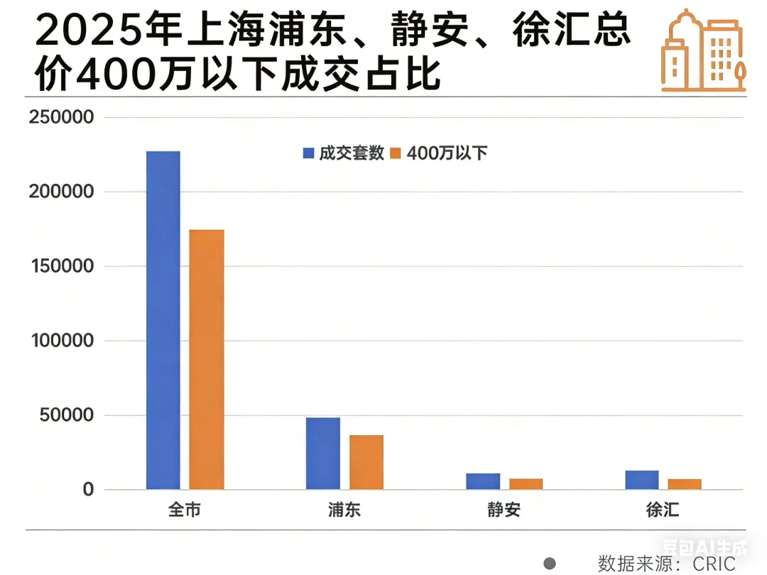 克而瑞数据显示,浦东、静安、徐汇三大试点区,收购房源聚焦总价400万元以下的刚需品类。这也是市场上购买需求最旺盛的一类房源。2025年上海二手房成交套数约22.7万套,其中总价400万元以下成交占比达76.71%。在三个试点区,该总价段成交占比均超50%,浦东、静安更是分别达75.32%、66.24%。