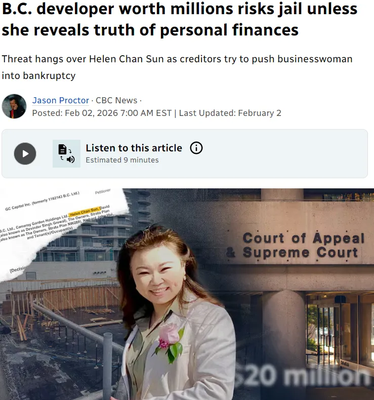 除了有关Helen个人财务状况的种种谜团之外,这些记录还为我们揭示了温哥华曾经繁荣的房地产和公寓市场如今陷入衰退的状况,而Helen则试图将自己目前资金流动性不足归咎于这一市场衰退。